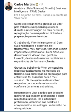 Serviços de (1) Repaginação de LinkedIn; (2) Reformulação de Currículo; (3) Preparação para entrevistas; e (4) Tradução